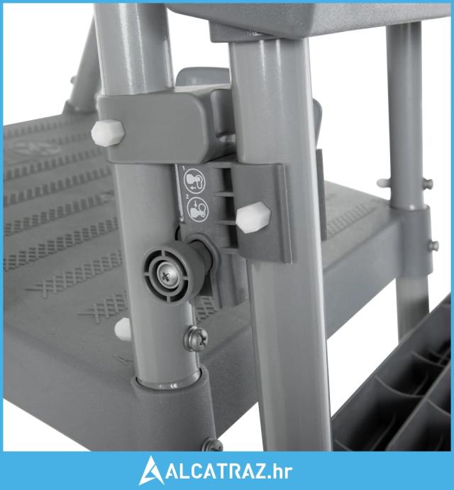 Ljestve za bazen s 4 stepenice imaju čvrst metalni okvir otporan na hrđu. Protuklizne, snažne plastične stepenice čvrsto su spojene za okvir i pružaju siguran način da plivači uđu u bazen ili iziđu iz njega. Osim toga, postoji platforma sa zaštitnim pločama i 2 čvrste ručke. Set stepenica na vanjskoj strani ljestvi može se preklopiti kako bi se spriječila uporaba ljestvi od strane djece i izbjegle nezgode.