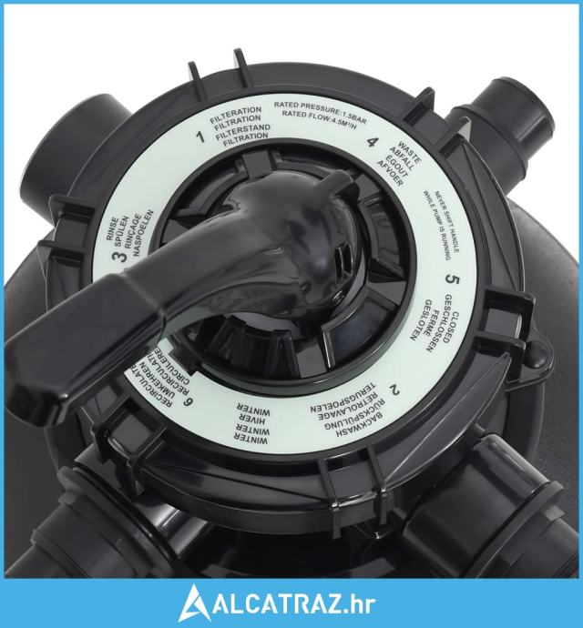 - Višesmjerni ventil sa 6 položaja: filtar, povratno ispiranje, ispiranje, otpad, recikliranje i zatvoreno
