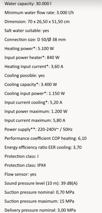 Zahvaljujući toplinskoj pumpi Waterpower 5000 s funkcijom grijanja i hlađenja, možete savršeno prilagoditi temperaturu vode svom osjećaju ugode. Toplinska pumpa impresionira minimalnim održavanjem, integriranom kontrolom putem LCD zaslona i funkcijom hlađenja bez dodatne naknade. Zahvaljujući ugrađenom izmjenjivaču topline od titana, toplinska pumpa idealna je i za bazene sa slanom vodom. Koncentracija soli ne smije prelaziti 0,50 % (što odgovara 5 g/l ili 5.000 ppm).