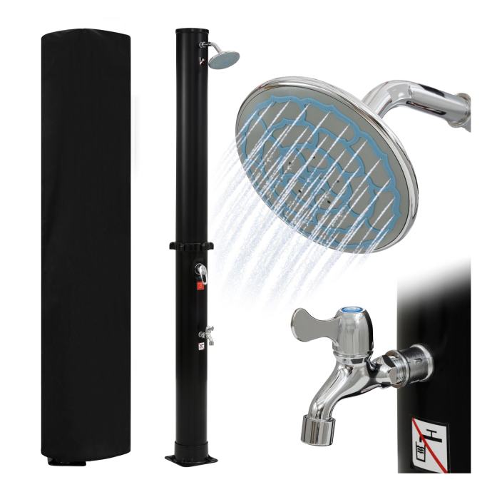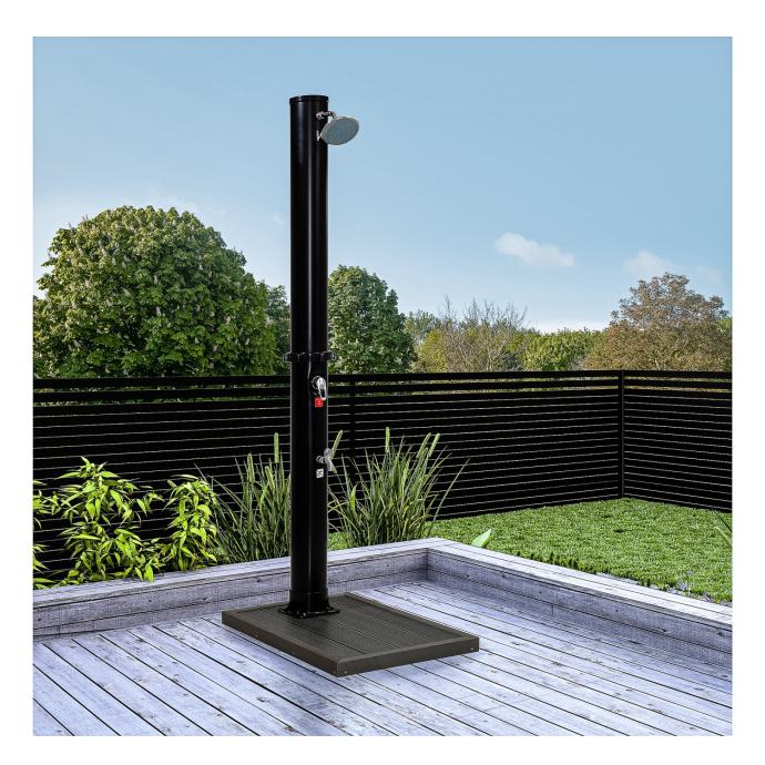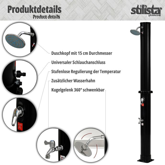 Solarni tuš STILISTA izrađen je od plastike otporne na UV zračenje i nadopunjuje vaš vrt, terasu ili bazen. Naš vrtni tuš je ekološki prihvatljiv i štedi energiju zahvaljujući solarnoj energiji. Uz idealan položaj i izloženost suncu, voda se može zagrijati i do 60°C. Zahvaljujući jednoručnoj miješalici, topla voda u spremniku se miješa s hladnom vodom iz vrtnog crijeva. Glava tuša vrtnog tuša ima 360° okretni kuglasti zglob promjera 15 cm. To vam omogućuje podešavanje položaja vodenog mlaza ako želite. Tuš je dostupan u crnoj i crno/srebrnoj boji, a tu je i set s pripadajućim podnim elementom.