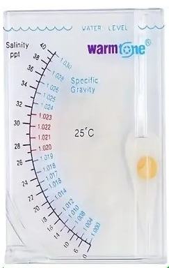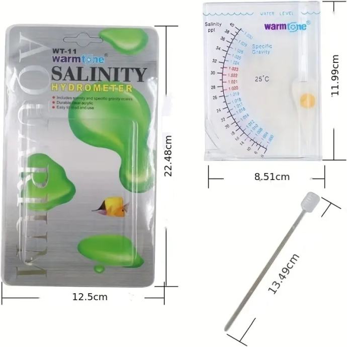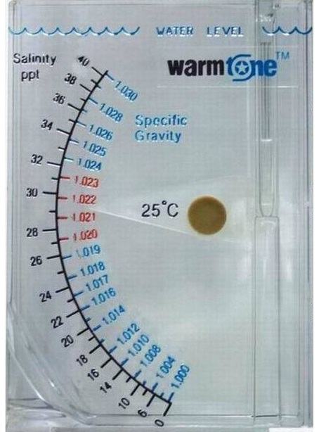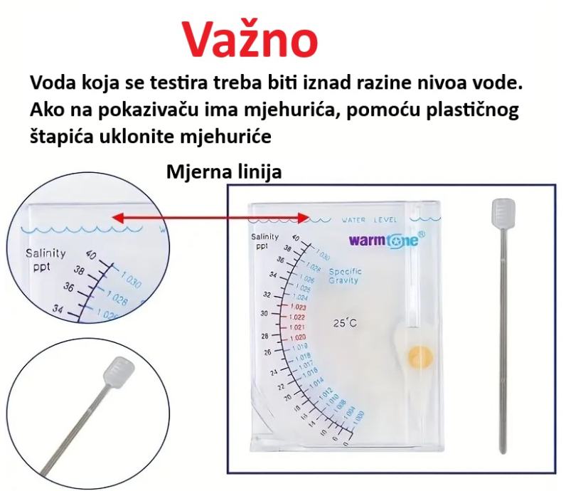 Molimo vas da ga polako stavite u vodu za mjerenje dok voda ne dođe do crne linije urezane na mjeraču, a zatim očitajte vodoravno unutar ili izvan bazena. Ako je na kazaljci mjerača dok se stavlja u vodu nalaze mjehurići zraka, upotrijebite plastični štapić zajedno s mjeračem kako biste uklonili mjehuriće. (Prilikom mjerenja ne smije biti mjehurića zraka na cijeloj kazaljci.) Vanjski raspon skale označava salinitet (PPT). Unutarnji raspon skale označava gravitaciju. Preporučuje se raspon gravitacije između 1,020 i 1,023 na temperaturi od 25°C. Nakon upotrebe mjerač treba očistiti slatkom vodom za čišćenje. Mjerač neće ispravno očitavati ako na kazaljci ima soli. Zatim ga treba očistiti namakanjem u toploj vodi ili octu najmanje 30 minuta. Zatim ga osušite na hladnom mjestu.
