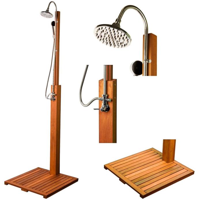 STILISTA® drveni vrtni tuš izrađen od 100% Shorea tvrdog drveta s dodatnim ručnim tušem. Tuš u bazenu, tuš u sauni, tuš u vrtu za kampiranje, drveni tuš