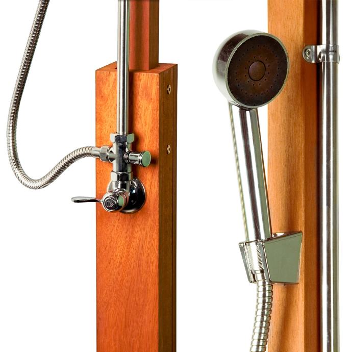 Materijal: tuš od tvrdog drva Shorea tropskog ulja otpornog na vremenske uvjete, glava tuša, jednoručna miješalica i kromirana poluga na potezanje