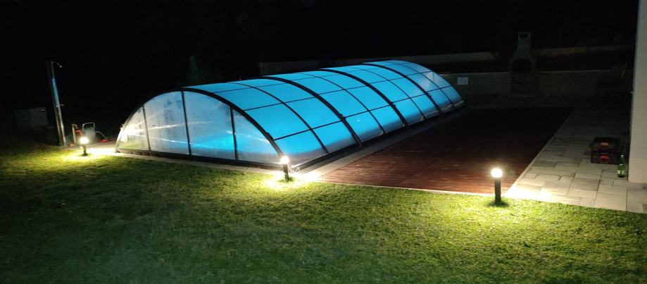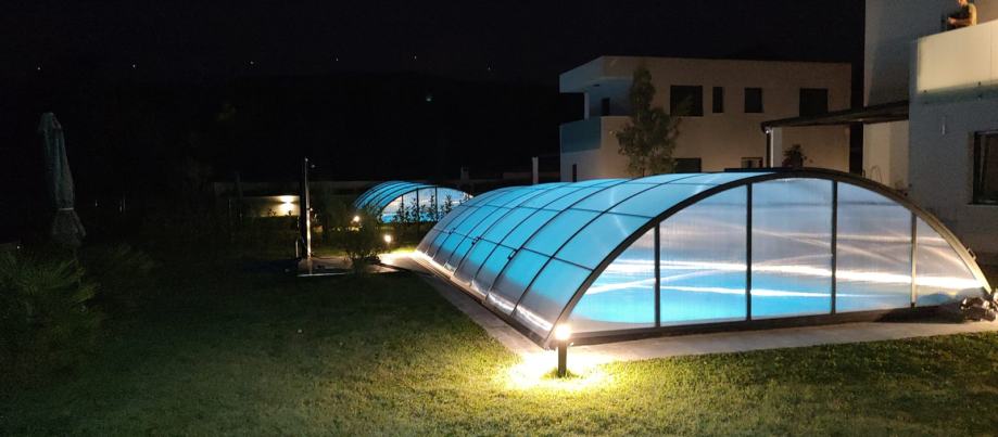 Pomične kupole za bazene izrađene su od aluminija i polikarbonata te tako čine čvrstu a laganu strukturu sa elegantnom notom dizajnerskog izražaja. Kako je cilj produženje sezone i popunjavanje ponude u zimskim mjesecima ovaj dio opreme za bazene je postao neizostavan svatkome tko se ozbiljno bavi i proaktivno poslovno razmišlja o turističkoj sezoni. Vrlo su lake i jednostavne za rukovanje tako da u trenu bazen možete prakriti sa kupolom i u trenu otvoriti. Kupole imaju višestruku namjenu pa tako i koriste kao zaštita od prljavštine i raznih vanjskih utjecaja pa tako štite vodu od raznih vanjskih nečistoća što pridonosi uštedi filtracije vode i čišćenja bazena.