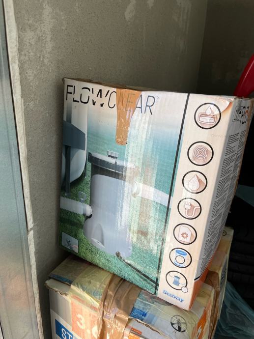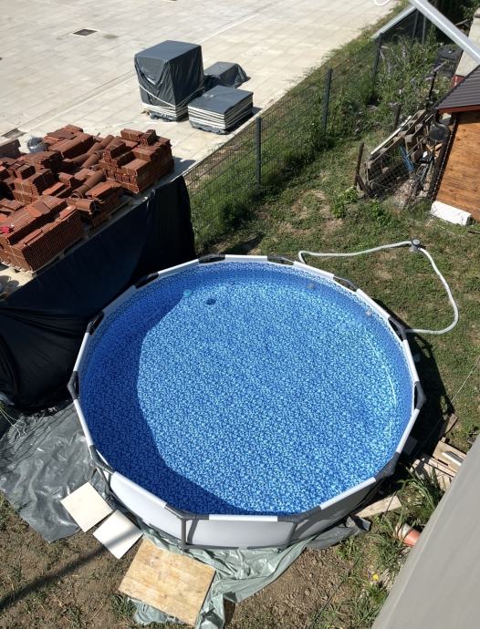 Uz bazen dolazi jedna manja pumpa jedna veca mi smo koristili samo tu vecu jer manja nije bila dosta, takoder dolazi i prekrivac za bazen.
