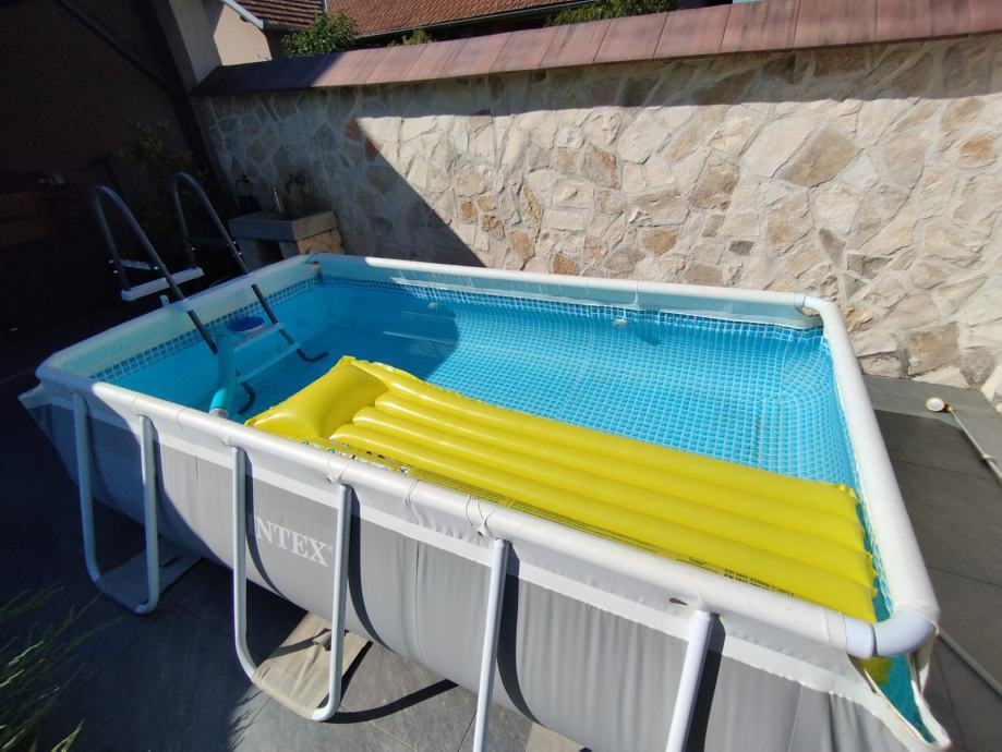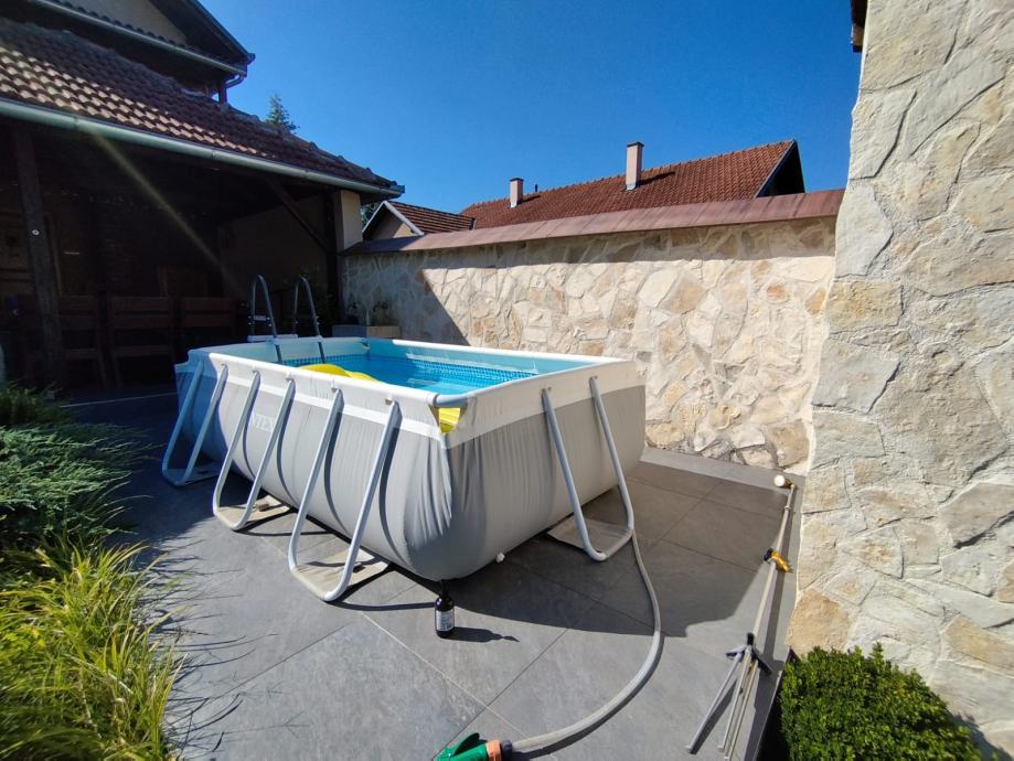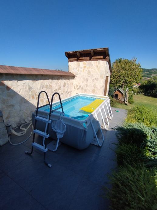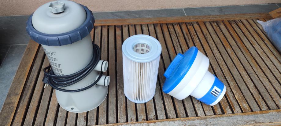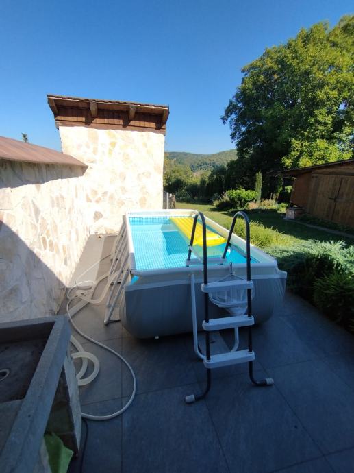 Dimenzije: 3mx1,75mx80cm. Bazen je korišten dva ljeta tj sastavljan ali nije se baš kupalo u njemu. Dobro izgleda i očuvan je (pogledati slike). Uz bazen ide filter, tablete, stepenice za ulazak, mreža za bazene za čišćenje, cerada za prekrivanje i suncobran samostojeći.