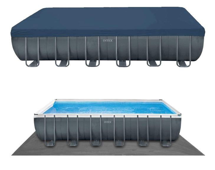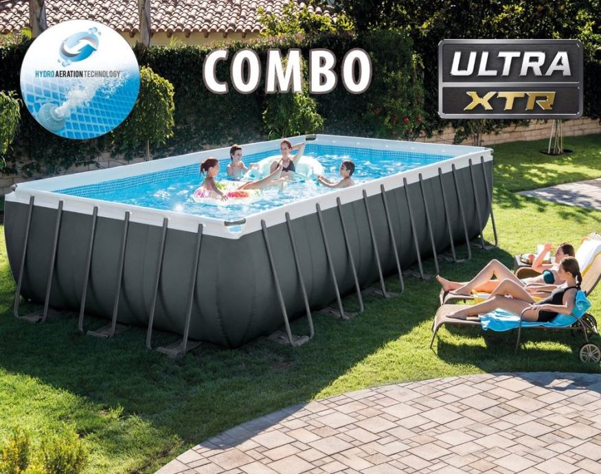 Pravokutni Intex bazen veličine 732 metra je najpopularniji bazen većih dimenzija! Napravljen je od izuzetno čvrstog platna (3-ply material PVC+poliester). Novi XTR model sa predivnim tiskom plavih pločica i elegantnim sivim eksterijerom. Zahvaljujući inovativnoj konstrukciji su cijevi ovalne i s tim jače, »easy lock« sistem omogućuje hitro montiranje. Patentirana Hydro Aeration™, tehnologija je jedinstvena karakteristika, koja povećava količinu kisika u vodi, zato filter lakše odstranjuje prljavštinu i pruža bistriju vodu. Zbog svojih dimenzija, primjeren je za cijelu obitelj i prijatelje, možete ga koristiti i za vodene igre kao što su vaterpolo, odbojka i vodeni aerobik. Intex bazeni iz linije Ultra Frame imaju jedinstvene okvire, koji su jači od tradicionalnih metal ili prism frame modela. Izuzetna preciznost izrade metalnog okvira poboljšava kvalitetu, sigurnost i stabilnost. Metalni okvir brzo montiramo sa slaganjem cijevi jedne u drugu. Ultra bazeni su dostupni sa svom potrebnom bazenskom opremom zato su jednostavni za održavanje. Osim toga, Intex bazeni imaju veću izdržljivost zahvaljujući optimiziranoj kombinaciji debljine zida i tvrdoće čelika.Ovaj bazen ima priložen pješčani filter sa klor generatorom, deluxe set za održavanje i set za igranje odbojke!Uz to, ima priloženu i:PodloguPokrivalo, koje se priveže na bazenLjestve sa odstranljivim stubamaUpute + DVDTehnička svojstva:Dimenzije: 732 x 366 x 132 cmVeličina skupa sa potpornim šipkama: 787 x 422 cmTežina: 199 kg (2 paketa na 1 paleti)Volumen vode: 31.805 litara (90% punjenja)Dubina vode: 120 cmPriključak cijevi za crpku: 38 mmŠirok izbor dodatne opreme na voljuBazen morate postaviti na ravnu površinu.Prije postavljanja prčitajte upute za uporabu.Filter na pijesak ima ugrađen također i klor generator 2 u 1 za još čistiju vodu i niže troškove djelovanja. Sprava običnu kuhinjsku sol pretvara u prirodni klor za čišćenje vode. Klor generator spriječava nastanak algi, bakterija, gljivica, plijesni i tako umanjuje dodatnu kupnju kemijskih sredstava!Sol nije uključena. Za djelovanje potrebne su 3 kg soli na 1 m3 bazenske vode! Generator stvara 7 grama čistog klora na čas. Prečišćava 5.700 litara vode na čas, zato je namijenjen bazenima do 32.000 litara vode. Pješčani filter Intex može znatno umanjiti troškove kupovanja kemijsih sredstava za njegu vode, može djelovati dulje od filtera sa uloškom i omogućuje najbolju kvalitetu vode uz minimalni napor. Za djelovanje je potreban pijesak 0,45-0,85 mm, približno 23 kg ili 16 kg stakla. Pješčani filter bi morao biti uključen 5-6 sati na dan, npr.: 1 sat kupanja, 1 sat filtracije, 2 sata kupanja, 1 sat filtracije. Preporučujemo da tijekom kupanja filter ostane isključen.Protok crpenja 5.700 l/satVeoma izdržljiva korozijski otporna konstrukcija.Cjedilo za uklanjanje prljavštine, koje se samo spere. 6-stupanjski ergonomski ventil za jednostavno upravljanje (filtriranje, čišćenje, ispiranje, reciklaža, pražnjenje, zaključak), ventil obrnete na željenu funkciju.24-časovni timer za samostalno postavljanje Pijesak je potrebno zamijeniti svakih 5 godina.Moć: 220-240V, 0.25hp motorTežina: 25,5 kgPijesak nije uključen (za djelovanje potreban je pijesak, 0,45-0,85 mm, približno 23 kg ili 16 kg stakla)