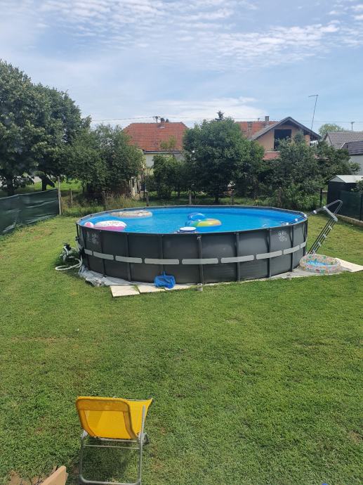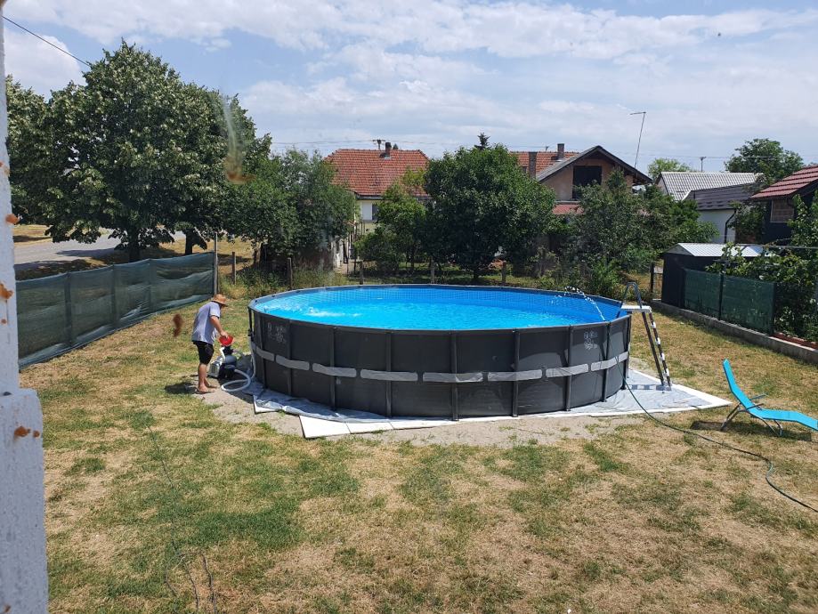 Cijena nije fiksna. Bazen je stabilan, gornji dio pobijelio od sunca. Dajemo i automatski usisavač i fontanu, velike zalihe klora u granulama i tabletama za taj bazen u vrijednosti 300,00 EUR.