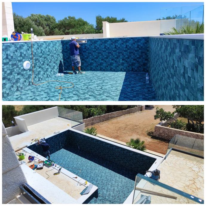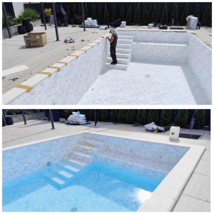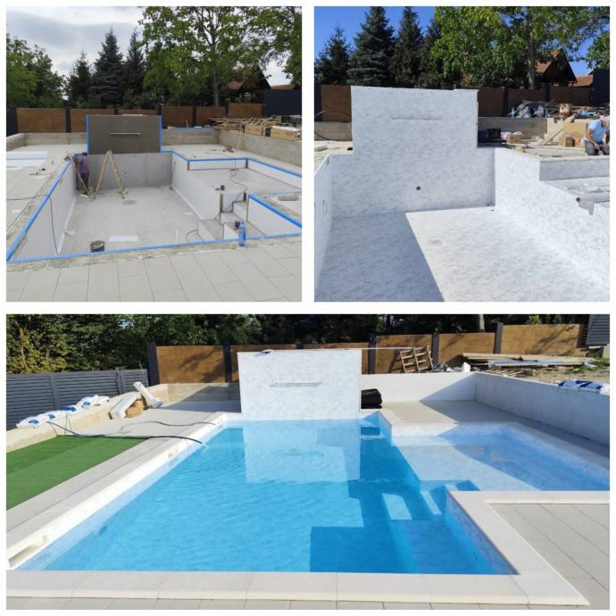 Bazeni od stiropor blokova (betonska jezgra 15 cm armiranoga betona). U cijenu uključeno: pumpa, filter, rasvjeta, folija i pribor za održavanje.