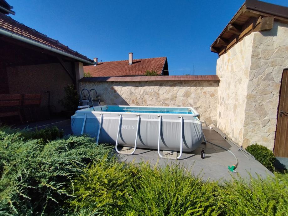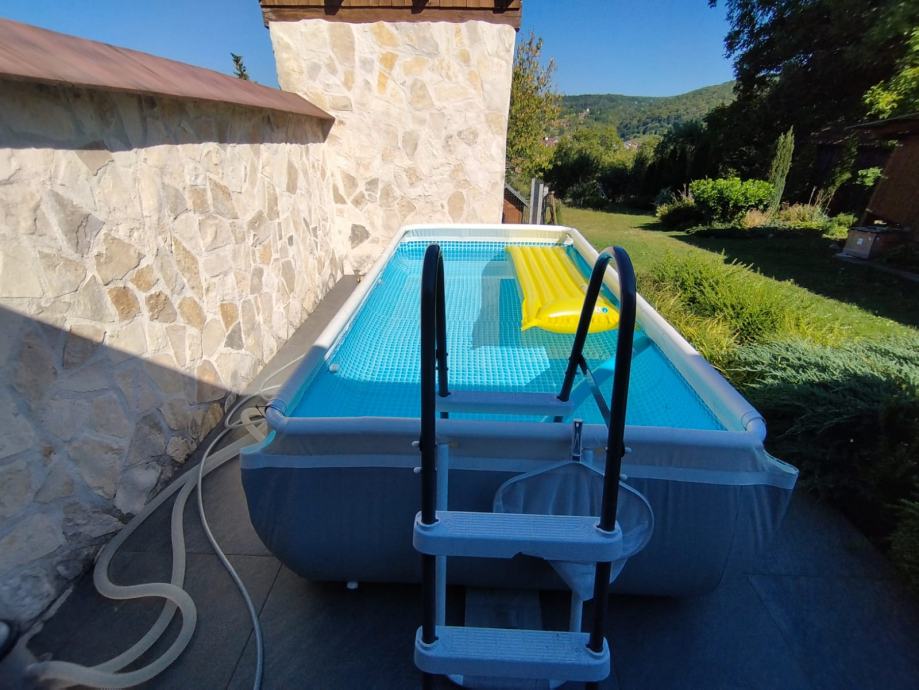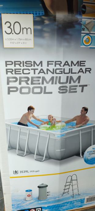 Bazen 3m u 1.75m x 80cm Inteks. Uz bazen ide filter, pakovanje tableta, stepenice za ulazak, mreža za čišćenje bazen, cerada Intex za prekrivanje, suncobran samostojeći. Trampolin je kupljen i Dechatlonu. Nije puno korišten. U odličnom stanju. Dimenzije: