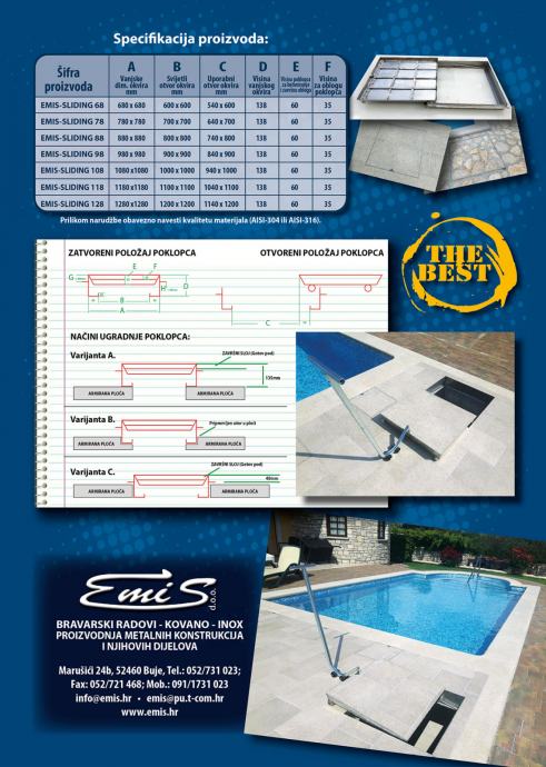 EMIS-SLIDING je patentirani podizno klizni poklopac predviđen za ispunu (kamen, keramika, i slično), bez vidljivih mehanizma za otvaranje.