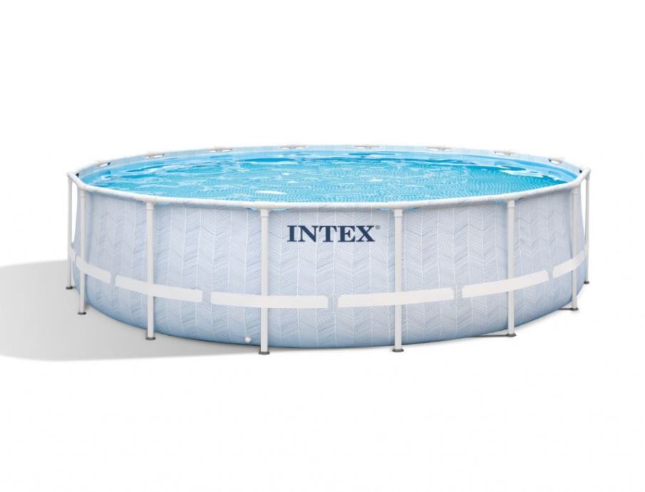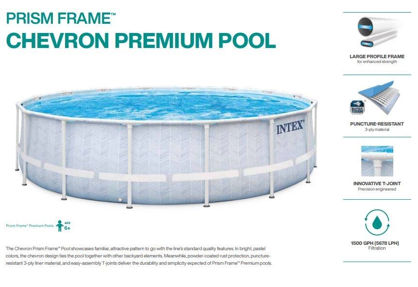Novi Intex Chevron Prism 488 x 122 cm Frame Pool s novijim uzorkom u svijetlim pastelnim bojama. Zaštita od hrđe obložena prašnim lakom, 3-slojno snažno platno i T-spojevi koji se lako sastavljaju pružaju izdržljivost i jednostavnost koja se očekuje od bazena Prism Frame™ Premium.Uključeno u paket:Kartušni filter: 5.678 l/satDimenzije: 488 x 122 cmTežina: 83 kgZapremina vode: 19.156 litara (puno 90%)Odvodni ventiliUključuje ljestve, prostirku, pokrov, filterVeč podatkov o izdelku si oglejte na tej povezavi