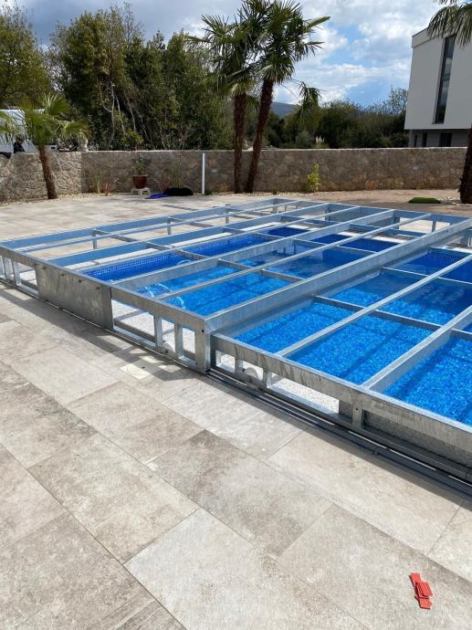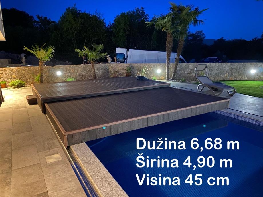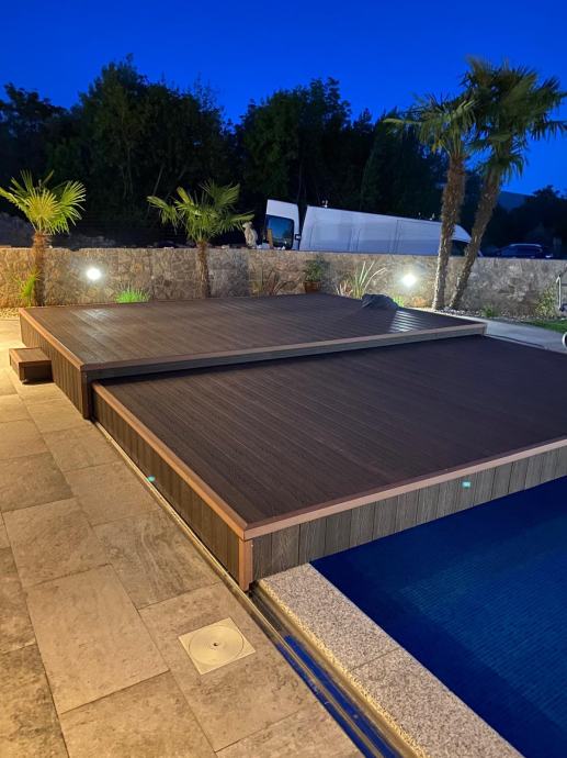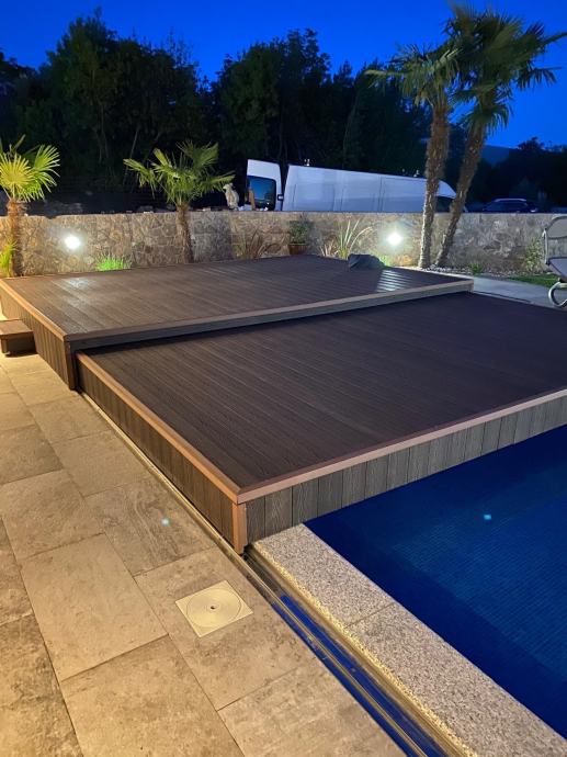 Imamo za Vas rješenje. Naš mobilni pokrivač za bazen sastoji se od dva dijela s udubljenom šinama. Svaki dio je pokretljiv za sebe.