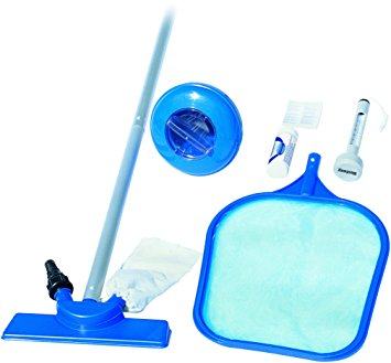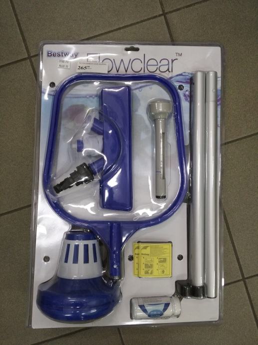 Set za čišćenje i održavanje bazena sastoji se od ručnog usisavača, sakupljaća površinskih nečistoća, klor dozera i plutajućeg termometra, trakica za kontrolu vrijednosti vode i seta za popravak. Usisavač se koristi uz pomoć priključka na vrtno crijevo. Dužina aluminijske ručke je 172 cm.