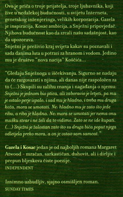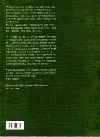 Roman ove suvremene kanadske spisateljice priča je o troje prijatelja-ljubavnika: Snježnom, jedinom preživjelom nakon "smaka svijeta", Koscu, vrhunskom znanstveniku i njegovu prijatelju iz djetinjstva i Gazeli, djevojci koju su obojica voljeli. Događaji koji dovode do velike kataklizme retrospektivno se izmjenjuju sa svijetom nakon katastrofe, čijim opustjelim predjelima i kojim haraju opasne UV zrake, tumara Snježni u svakodnevnoj potrazi za hranom i vodom. Zajedno s njim su Koščeva djeca, bića nastala genetskim inženjeringom, gotovo posve lišena ljudskih osobina. Roman je svojevrsni futuristički prikaz poraza čovječanstva, nestanka društvenih i civilizacijskih vrijednosti, apokaliptična vizija čovjeka koji nakon što je doživio vrhunac tehnologije i upravljanja prirodom postaje ponovno primitivna životinja s primarnim životnim potrebama.
