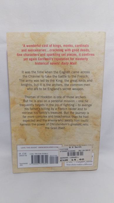 Following the phenomenal success of the Sharpe novels set in the Napoleonic Wars, Bernard Cornwell has turned his storytelling talents to another great moment in English history, the Hundred Years War between England and France throughout the 14th century. Harlequin is the first book in Cornwell's Grail Quest series, which chronicles the adventures of young Thomas of Hookton, "a big, bony, black-haired country boy". Thomas rejects the church in favour of the life of an archer in France after his village is brutally sacked by the French. The young Thomas fights back against the French with his bow, and "in that one instant, as the first arrow slid into the sky, he knew he wanted nothing more from life". He vows to seek revenge on the plains of France, and recover the holy relic of St. George stolen from his village by the sinister "harlequin" with whose destiny Thomas finds himself inextricably entwined. The rest of the action moves at a hectic pace across the violent and bloody battlefields of northern France, as Thomas falls for a beautiful French widow nicknamed "the Blackbird", makes a mortal enemy of the "poor, bitter and ambitious" Sir Simon Jekyll, and follows the ensign of King Edward III and his heroic son, the Black Prince. Harlequin is a fast-paced and graphic recreation of the Hundred Years War, despite a rather gratuitous fixation on rape and pillage. The action comes thick and fast, although it remains to be seen if Thomas of Hookton has the wit and flair of Cornwell's other great heroic creation, Richard Sharpe.