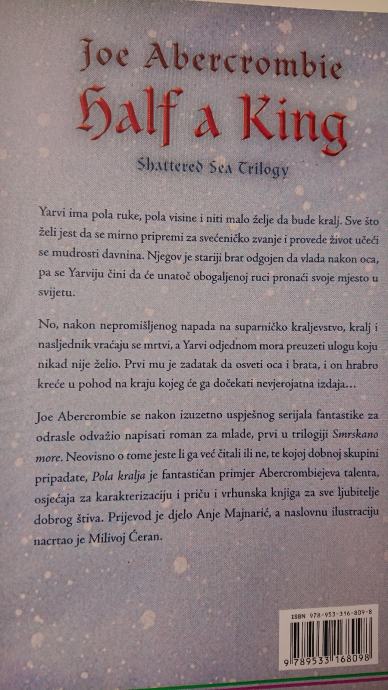 Joe Abercrombie se nakon izuzetno uspješnog serijala fantastike za odrasle odvažio napisati roman za mlade, prvi u trilogiji Smrskano more. Neovisno o tome jeste li ga već čitali ili ne, te kojoj dobnoj skupini pripadate, Pola kralja je fantastičan primjer Abercrombiejeva talenta, osjećaja za karakterizaciju i priču i vrhunska knjiga za sve ljubitelje dobrog štiva.