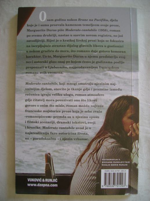 “Moderato cantabile”, koji mnogi smatraju njezinim najvažnijim djelom, snovito je tkanje gdje i praznine između rečenica igraju veliku ulogu, roman atmosfere gdje čitatelj mora povezivati ono što likovi govore s onim što misle, roman možda najveće francuske majstorice proze koja je sebe zvala “romanopiscem” premda su u njezinu opusu i filmski scenariji, dramski tekstovi, eseji i kronike. “Moderato cantabile” uvod je u najkreativniju fazu autoričina života, no paradoksalno i njezin vrhunac."