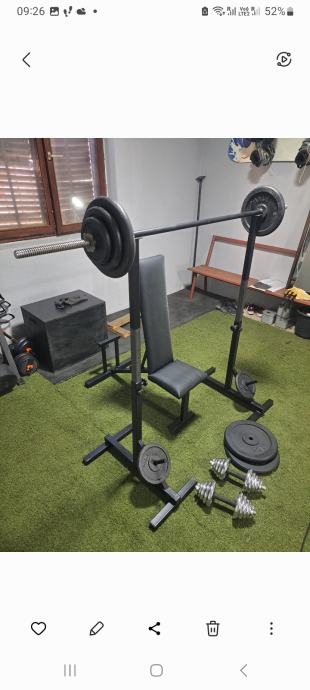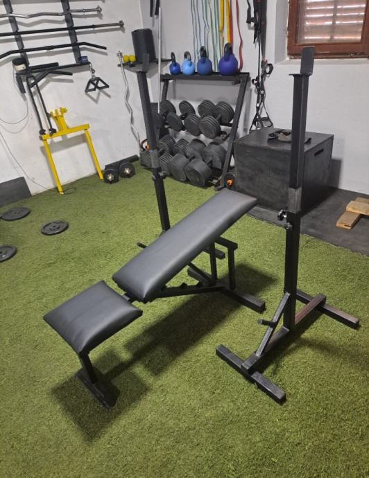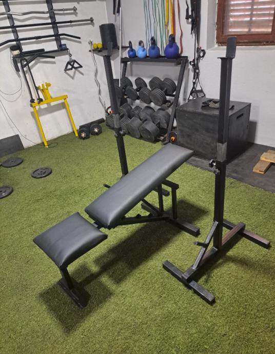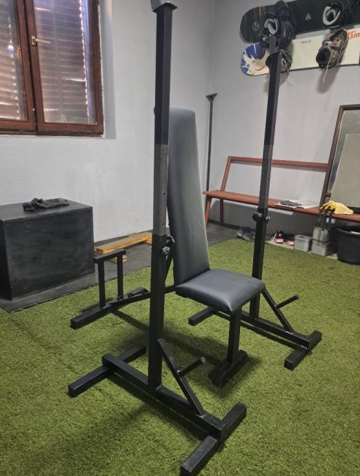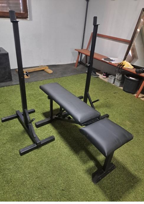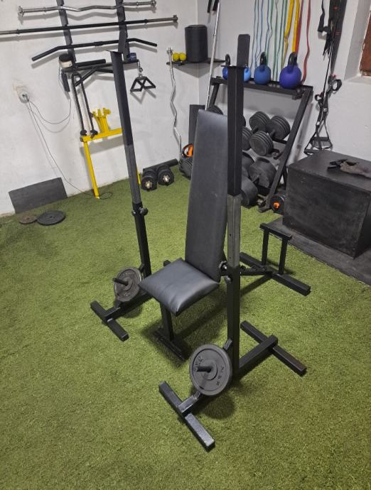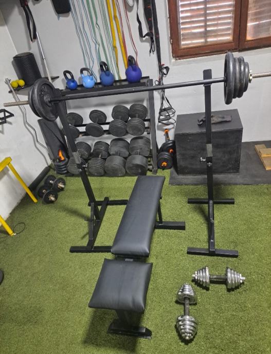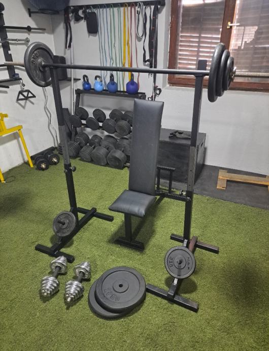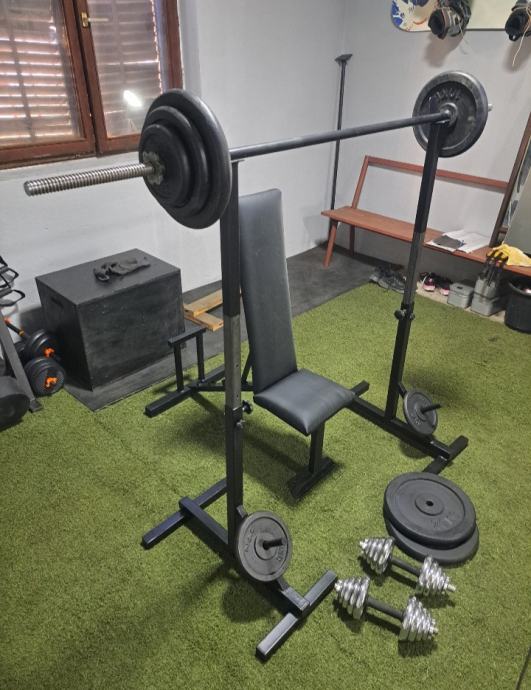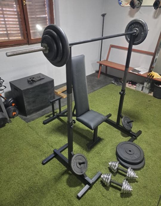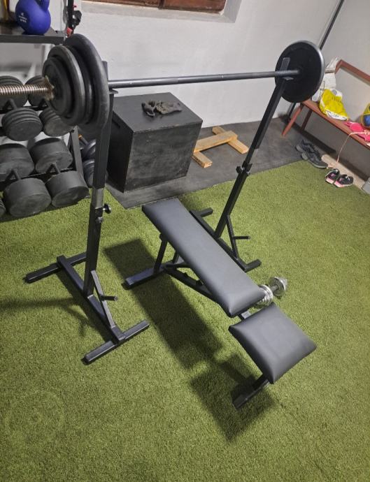 Prodajem bench klupu sa vise varijavija pomerania naslona tako da moze biti klupa ravna za bench klupa pod nagibom za kosi bench, klupa sa naslonom pod 90 stepeni za vjezbanje ramen bicepsa. Uz klupu prodajem I bucice 2x10kg I sipku sa 2x10 4x5kg 2x2.5kg ukupno sve 73kg. Uz sipku dodu nosaci koji se pomjeraju po visini, imaju sa prednje strane stalag za odlaganje utega. Moguce kupiti I 2x20kg uz doplatu tako da mozete imati 113kg utega.