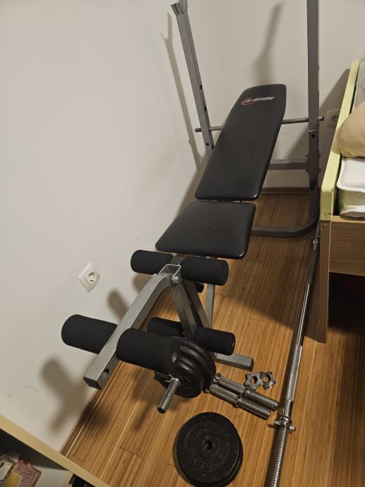 Prodajemo bench klupu sa 2 male šipke za ruke, jednom šipkom za utege i 4 utega po 5 kg, 2 utega po 2,5 kg.