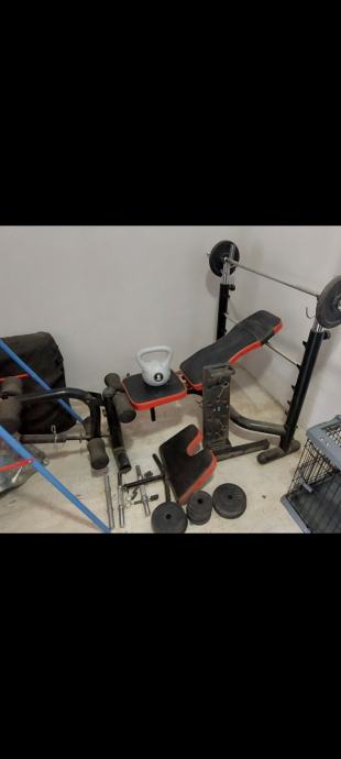 Prodaje se bench klupa,sipka,2x10kg,2x5kg,4×2kg,8×1kg.Tri male šipke,girija 6kg.