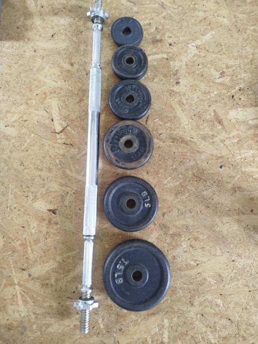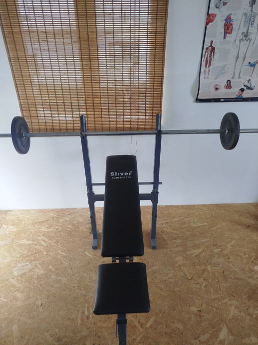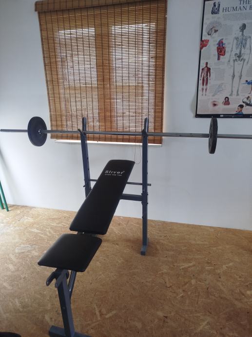 Prodajem bench klupu u kompletu s dvije šipke i 40 kg utega. Dva utega od 10 kg ostali su manje kilaže. Standard šipka 220 cm. Druga je šipka manja i može se rastaviti.