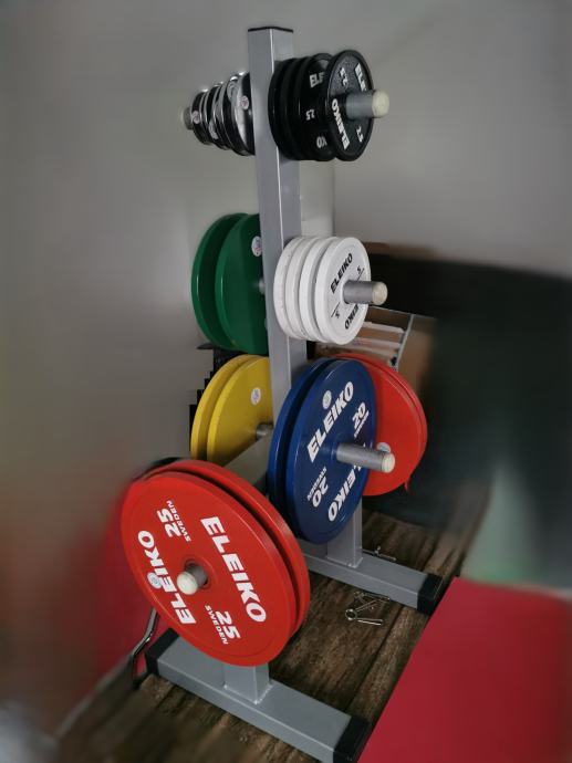 Prodajem natjecateljski Eleiko IPF combo rack (bench/squat), sa Eleiko IPF natjecateljskom šipkom, 210 kg Eleiko IPF natjecateljskih utega (25kg x 4 kom, 20kg x 2 kom, 15kg x 2 kom, 10kg x 2 kom, 5kg x 2 kom, 2,5kg x 2 kom, 1,25 x 2 kom, 0,50kg x 2 kom, 0,25kg x 2 kom, te parom Eleiko IPF natjecateljskih collarsa (2,5kg x 2 kom). U cijeni je i masivni stojeći stalak za utege. Sve je u izvrsnom stanju jer je korišteno samo privatno za pripreme za natjecanja. Ne prodaje se pojedinačno, već samo kao komplet.