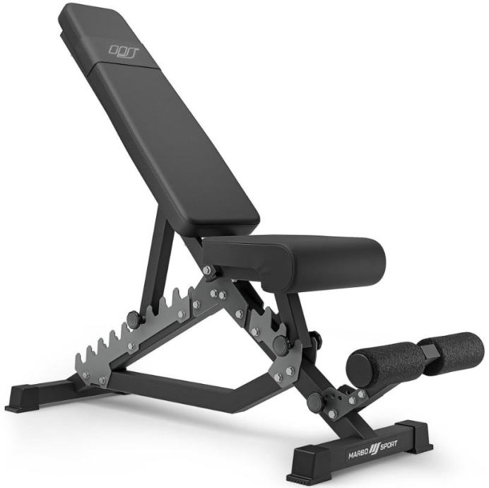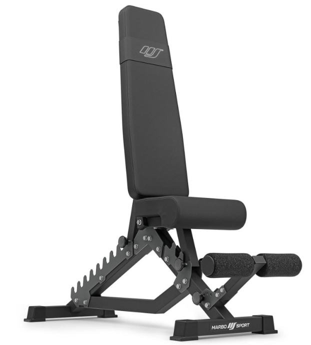 Nova Marbo klupa za vježbanje 2.0 omogućuje širok spektar vježbi s utezima i trening trbušnih mišića. Semi-Pro 2.0 nova je serija uređaja i dodataka tvrtke Marbo Sport namijenjena naprednim kućnim korisnicima. Klupa je poboljšana verzija starijeg crvenog modela. Omogućuje mnogo različitih kutova vježbanja, uključujući negativne za leđa i sjedenje. Masivni čelični profili stvaraju konstrukciju otpornu na velika opterećenja do 300 kg. Podesiva potpora za noge pruža udobnost i stabilnost za vježbanje trbušnih mišića.10 položaja naslona (od -21 do 82°)3 položaja sjedala (0°, 14°, 26°)Visokokvalitetna crna presvlaka od eko kožeNavlaka, ojačana remenom, ne trlja se čak ni uz intenzivnu upotrebuZaštitne gumene noge za parket ili pločiceDimenzije: 48 (v) x 45 (š) x 125 (d) cm -148 cm (pod kutom naslona 0°)Dimenzije naslona: 81 x 27 cmDimenzije sjedala: 31 x 32 cmTežina: 22 kgPodešavanje oslonca za noge: 4 položajaDopuštena težina: 300 kgProfili: 50 x 50 mmMaterijal: čelikProizvedeno u EU