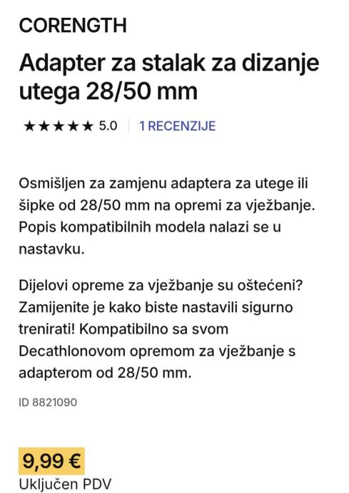 Također uz klupu dolazi adapter za korištenje olimpijskih utega posebno kupljen tako da se mogu koristiti utezi s rupom 28mm i 51mm.