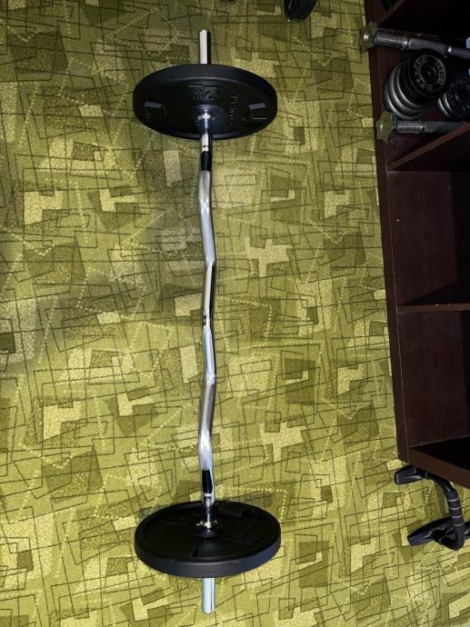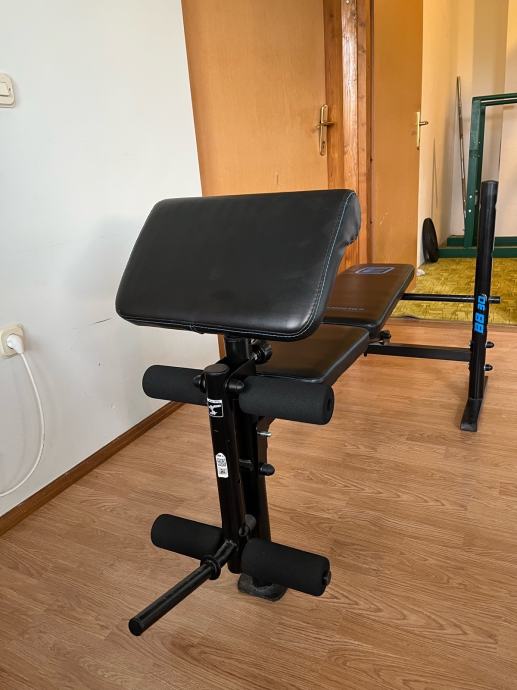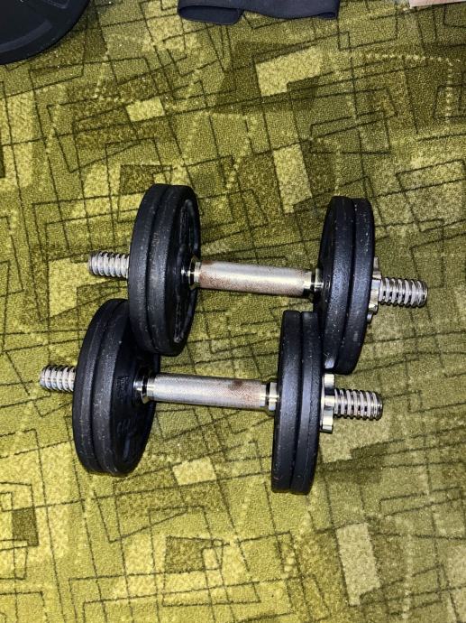Utezi uz rack su 2x20kg, 4x10kg, 4x5kg, 8x2kg i 4x0.5kg. 2x bučica, 2x ravne šipke, EZ šipka, 4x osigurača.