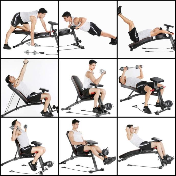 Sklopiva klupa na kojoj možete izvoditi dizanje utega, arm curl, leg extension, bench press, trbušne mišiće i vježbe za ruke s pričvršćenim elastikama. Može se sklopiti nakon vježbanja. Ima podesivi nagib za vježbanje mišića ruku iz različitih kutova.Crna bojaTežina: 12 kg25 mm za diskoveDopuštena težina (korisnik + utezi): 120 kgPakiranje: 34 x 29 x 74 cmTakođer negativan nagibUtezi nisu uključeni