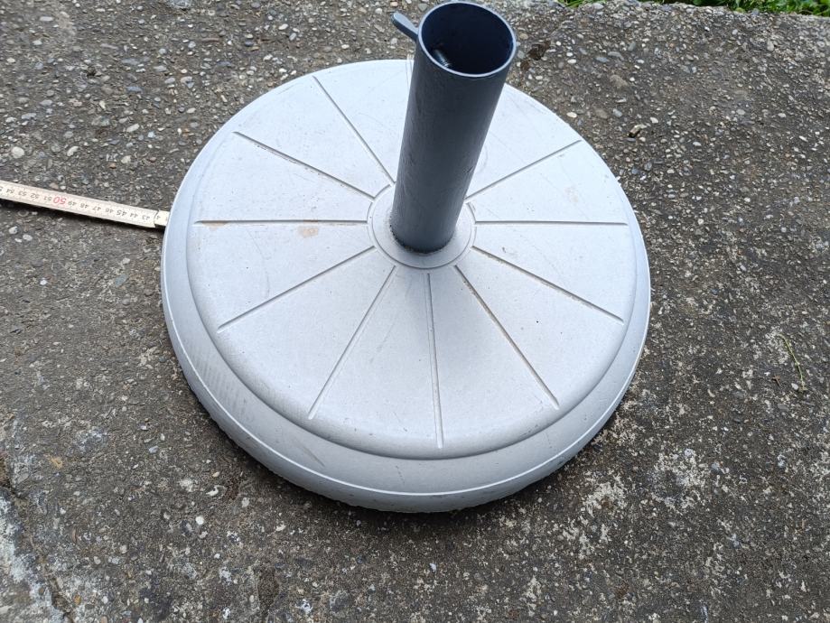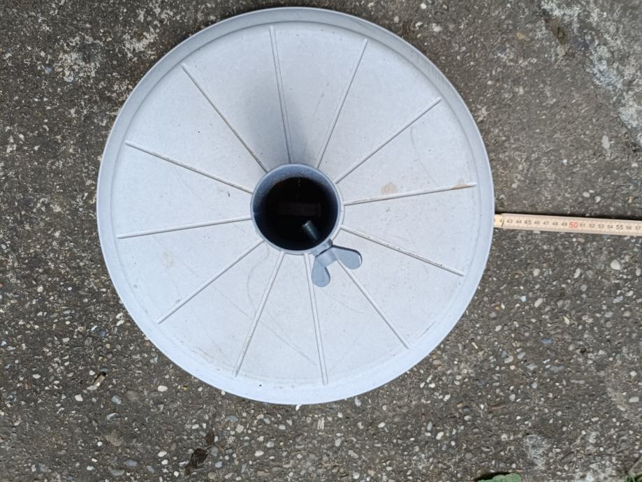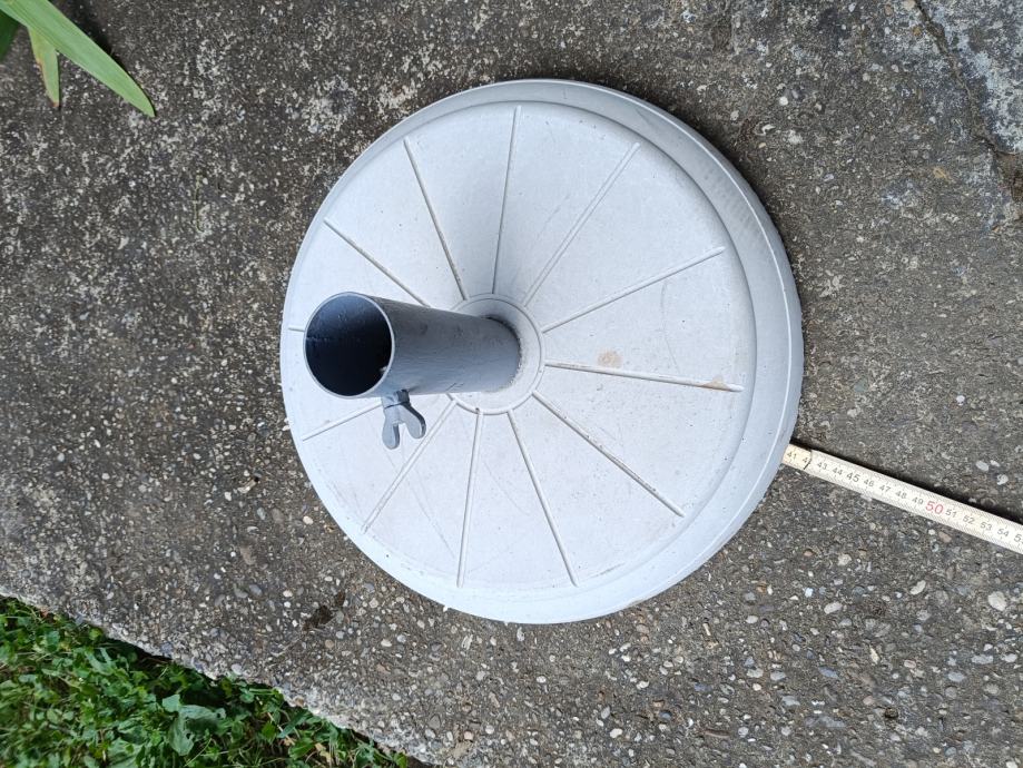 Prodaje se novi stalak za suncobran, donji promjer je 41,5cm. Debljina cca 7cm, težine oko 10kg. Nutarnji promjer rupe je 4,5 cm. Molim bez poruka.Preuzimanje dan nakon dogovora iza 17h ili vikendom.