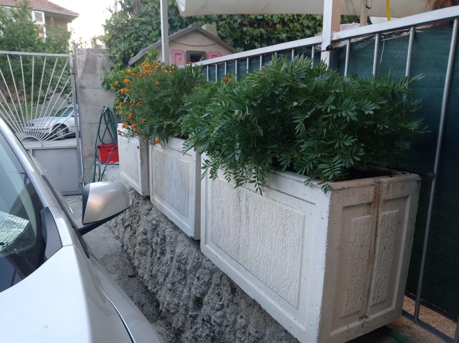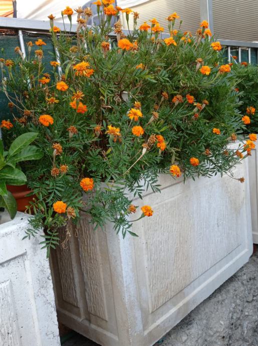 Prodajem žardinjere za cvijeće od visokokvalitetnog vibriranog betona, 3 komada zajedno u kompletu za ukupno 1200 kn, dimenzije(Š × V × D): 40 x 50 x 80 cm, s posađenim lovorom i kadificama.
