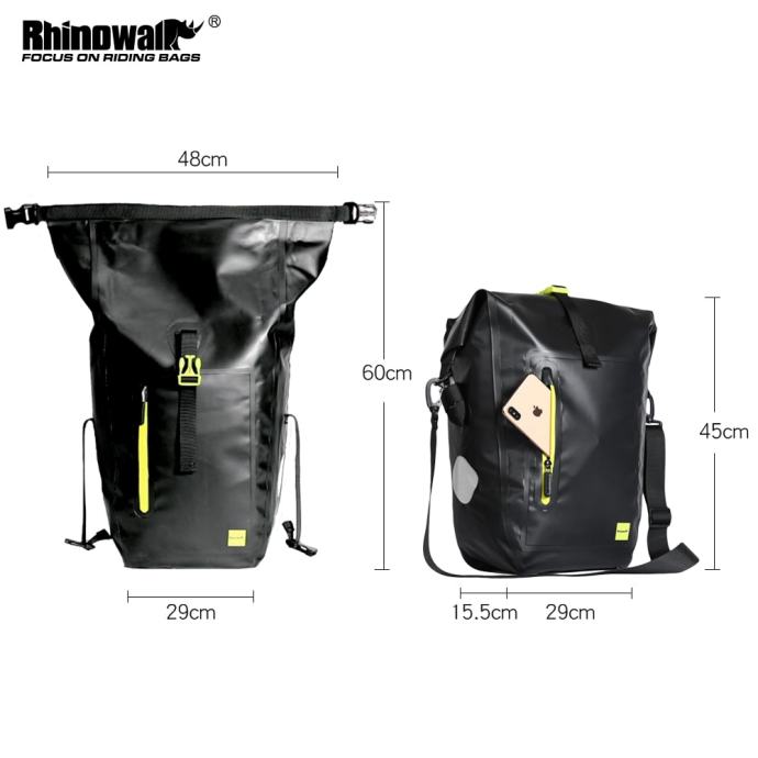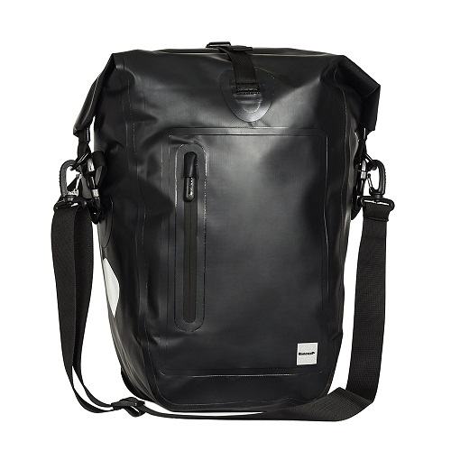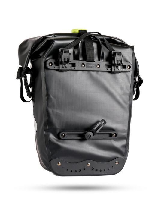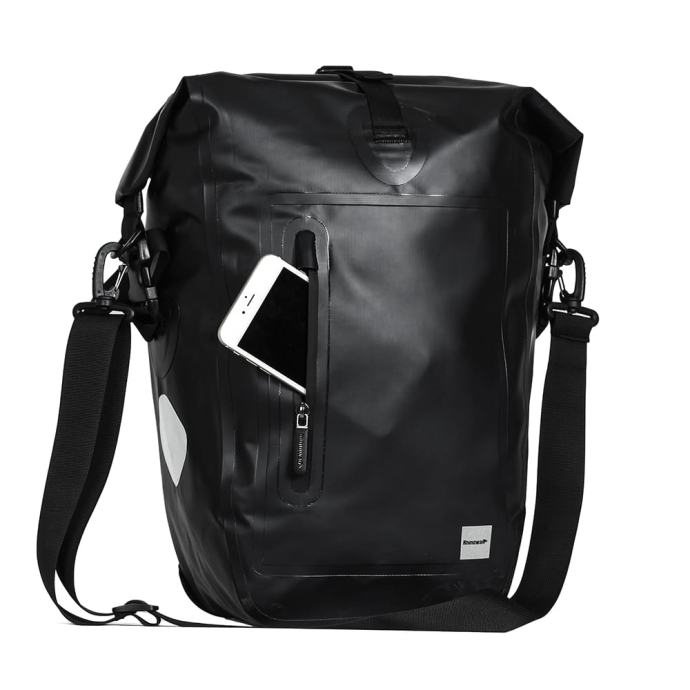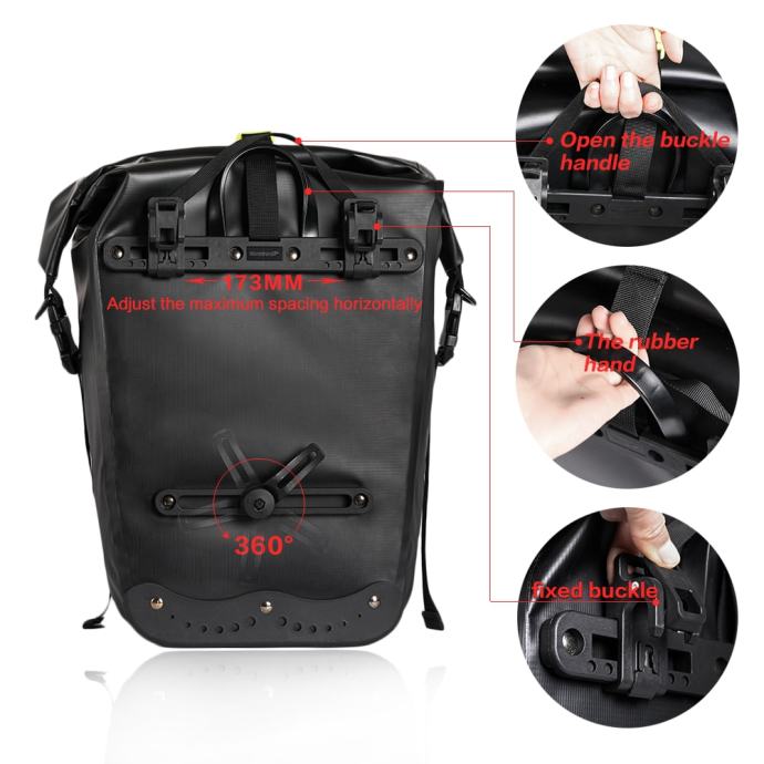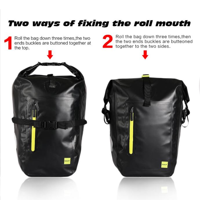 Ova velika biciklistička torba (bisaga) napravljena je od 1000D poliesterskog materijala s vodootpornim PVC slojem s obje strane, potpuno vodootporna, otporna na habanje i savršeno štiti vaše predmete. Svi šavovi su toplo vareni, čime je postignuta razina vodootpornosti IPX-5.