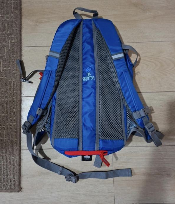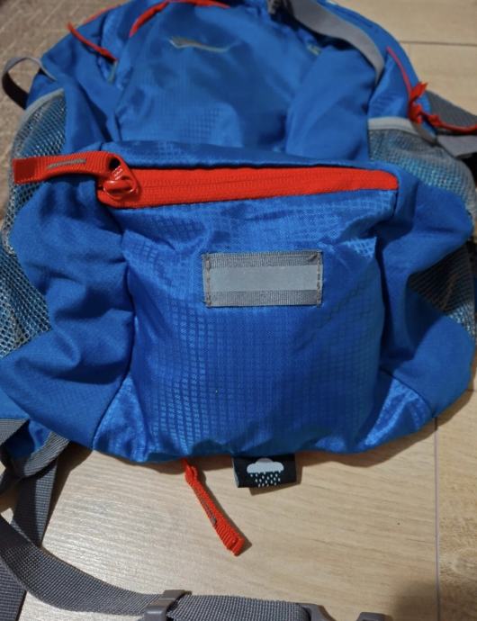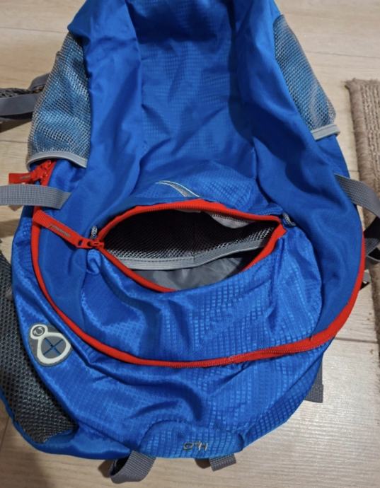 Uključuje mrežicu za kacigu u zasebnom prednjem džepu i navlaku za kišu u zasebnom donjem džepu.