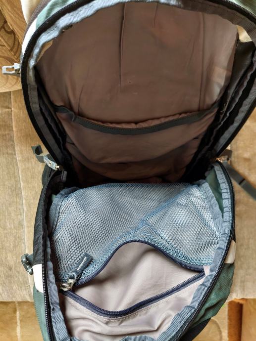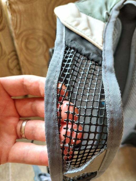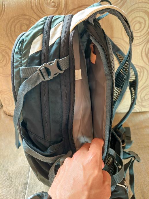 Sve kopče i zatvarači su funkcionalni i bez oštećenja. Nema nikakvih poderotina na tkanini. Jedino oštećenje na ruksaku je ispucala plastična mreža na desnoj naramenici. To oštećenje ne utječe na funkcionalnost pošto svu težinu nose prošivne trake na rubovima naramenica. Mreža je tu samo zbog prozračnosti.