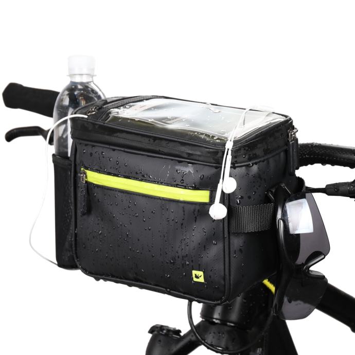 Super velika torba za bicikl na volan s prozirnim dodirnim zaslonom na vrhu za držanje telefona ili zemljopisne karte. Dvije mrežaste vrećice sa strana torbe za male uređaje kao dodatni prostor.
