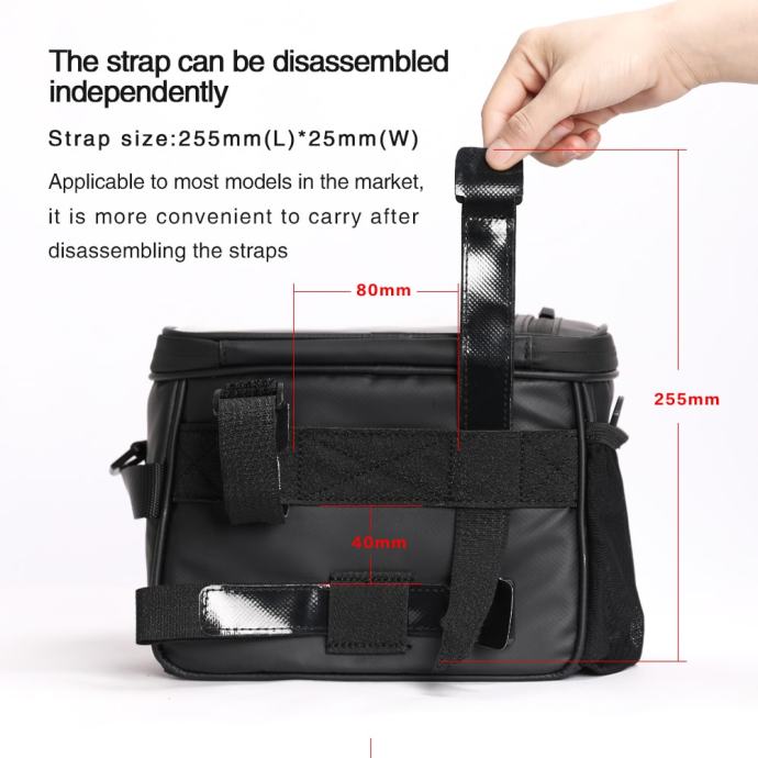 Torba se pomoću fleksibilnih traka sa čičkom jednostavno pričvršćuje na volan bicikla i jednostavno se skida. Dolazi s naramenicom, može se koristiti za nošenje torbe nakon skidanja od bicikla.