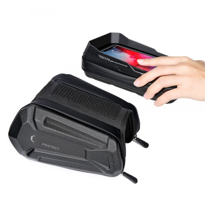 Nosač je postavljen na okvir bicikla, koji je ujedno i praktičan pretinac i navlaka za naš pametni telefon.