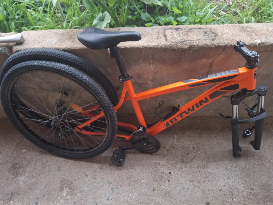 Prodajem dva bicikla marke B'Twin zajedno s dodatnim dijelovima. Prvi je potpuni brdski bicikl sive boje s plavim detaljima, opremljen prednjom vilicom s amortizerom, terenskim gumama i mjenjačem brzina. Drugi je narančasti B'Twin bicikl čiji je okvir odvojen od prednje vilice, koja se prodaje kao zasebni dio.