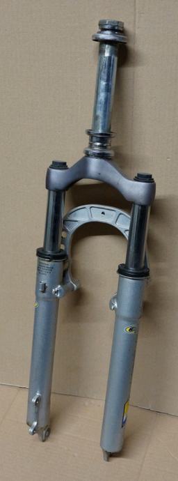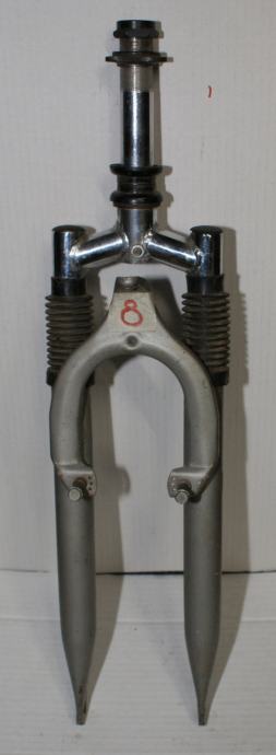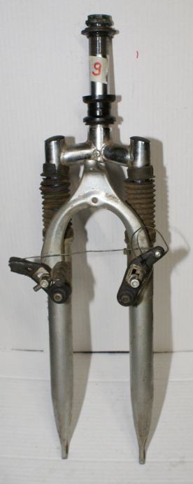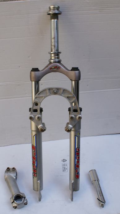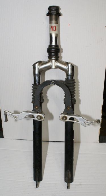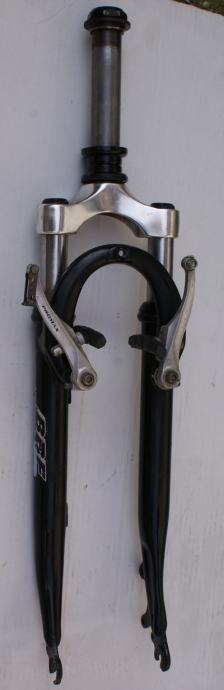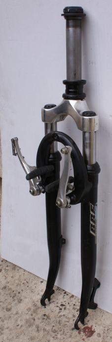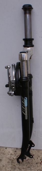 Fotografije 12. - 14. Vilica BBFR COMFORT SISTEM za sportski bicikl s amortizerima za bicikl 26 cola. Hod amortizera oko 90 mm. Mogućnost montaže V-brake kočnica ili disk kočnica na ušice koje se nalaze na zadnjem dijelu vilice. Vilica je u dobrom stanju – vidljivi tragovi korištenja i ogrebotine na pojedinim mjestima, raspon od gornjeg dijela do mjesta gdje dolazi osovina kotača 385 mm. dužina vrata na vilici je 165 mm. CIJENA ZA VILICU JE 19 €