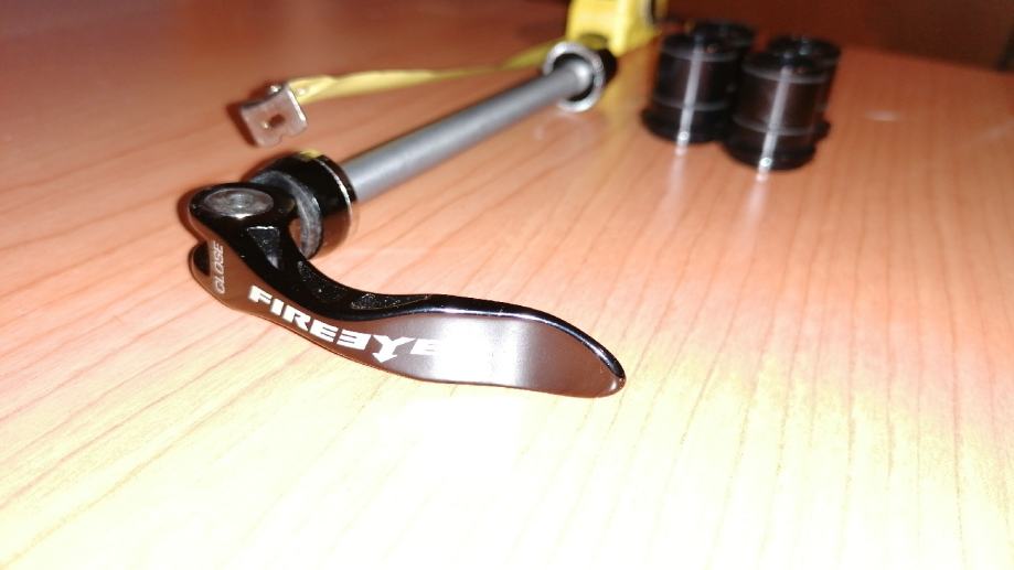 Prodajem novu, nikad korištenu Fireeye quick release osovinu prednjeg kotača. Osovina dužinon odgovara standardnoj 110mm prednjoj MTB nabi. Debljina osovine je 10mm. Uz nju dolazi end cap adapter nabe sa 10 na 15mm (na slici donji). I dolazi 15mm end cap (na slici gornji). Oba end capa funkcioniraju sa fireeye nabom. Sa 15 mm end capom koristi se 15mm osovina.