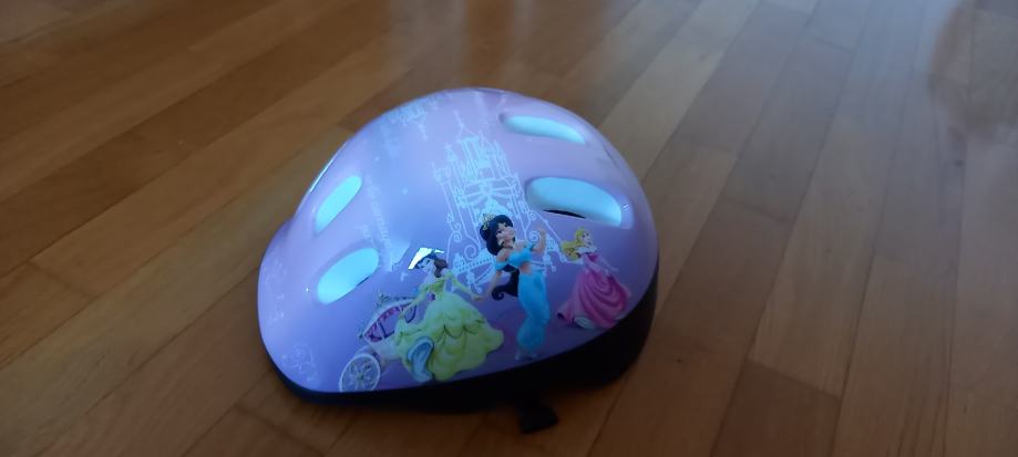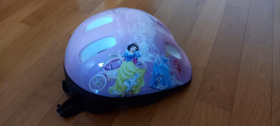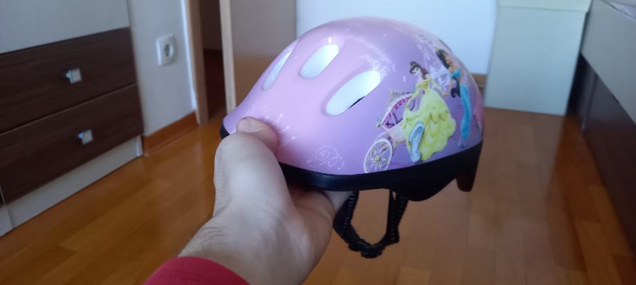 Kaciga za djevojčice veličina S, sa slikama Disney likova. Lagana i prozračna, s trakicama za stezanje.