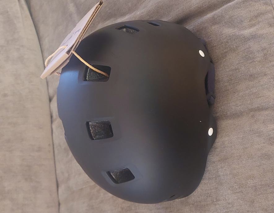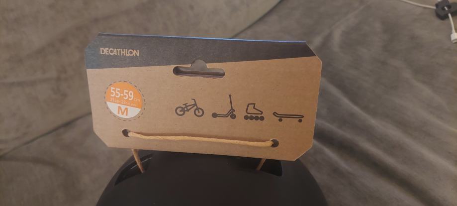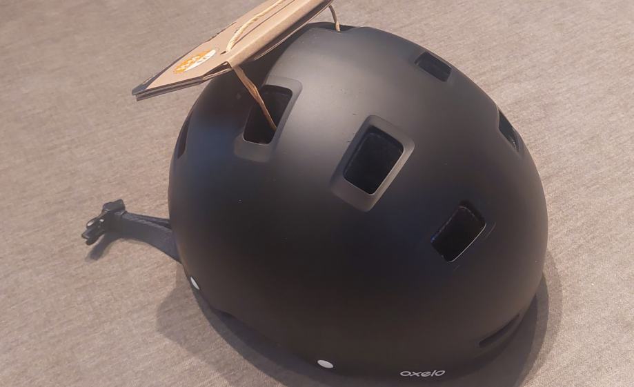 Nova zaštitna kaciga Decathlon veličine M, crne boje, univerzalna za bicikl, romobil i skate. Idealna za sigurnu vožnju s ventilacijskim otvorima za udobnost tijekom dužih vožnji.