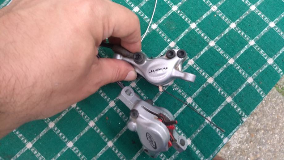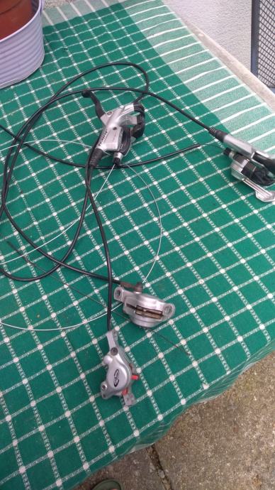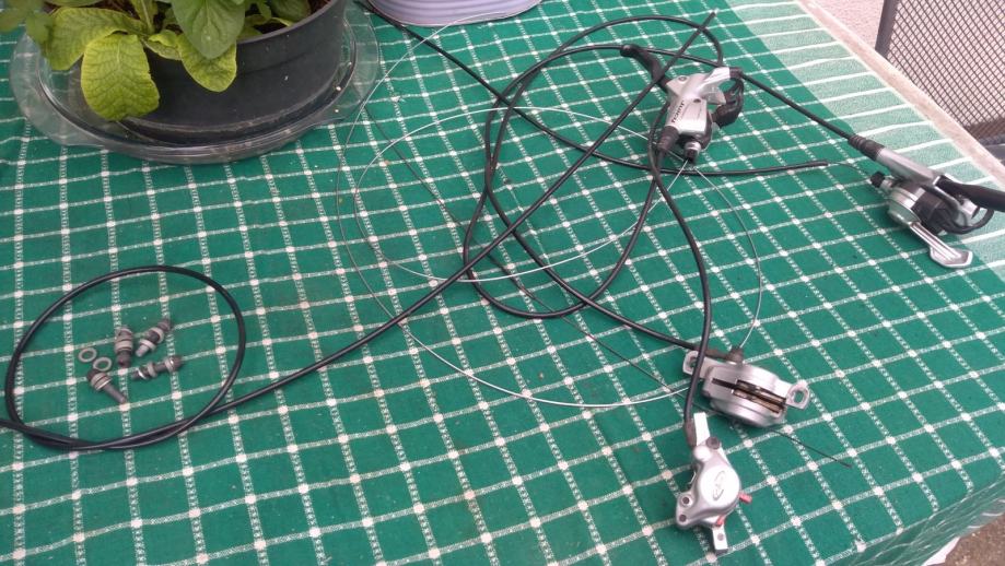 Avid Juicy 5 kocnice + SRAM X9 3x9 shifteri, na zajednickom nosacu radi ustede tezine, kocnice: novo ulje i straznje pakne, prednjih ima puno, jako lijepo koce, shifteri idu sa sajlama i buzirima, sve kao na slikama, prodaja u setu, ako zelite individualnu prodaju onda moze JEDINO bez nosaca za prvo sta ode, u tom slucaju Avid=50E, SRAM X9= 85E, cijena za set 135E, sve cijene su fixne i zadnje