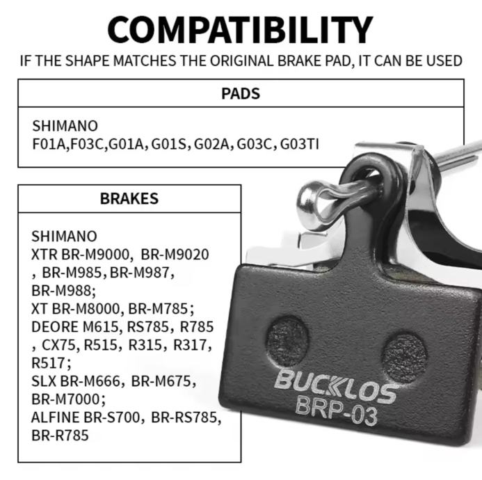 Wide Compatible With: BUCKLOS disk brake pads are compatible with Shimano XTR BR-M9000 BR-M9020 BR-M985 BR-M987 BR-M988,XT BR-M8000 BR-M785,Deore M615 RS785 R785 CX75 R515 R315 R317 R517,SLX BR-M666 BR-M675 BR-M7000,Alfine BR-S700 BR-RS785 BR-R785 etc. Also compatible with Shimano brake pads F01A F03C G01A G01S G02A G03C G03Ti