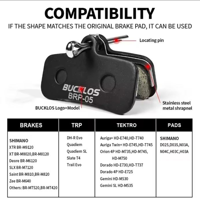 Wide Compatible With: BUCKLOS disk brake pads are compatible with Saint BR-M810 M820 M6120 Deore XT M8020 M8120 ZEE M640 XTR M9120 SLX M7120 MT420 MT520 Tektro HD M735 M745 M750 TRP SL Slate T4 Quadiem etc. Also compatible with Shimano brake pads D02S D03S N03A H03C H03A N04C