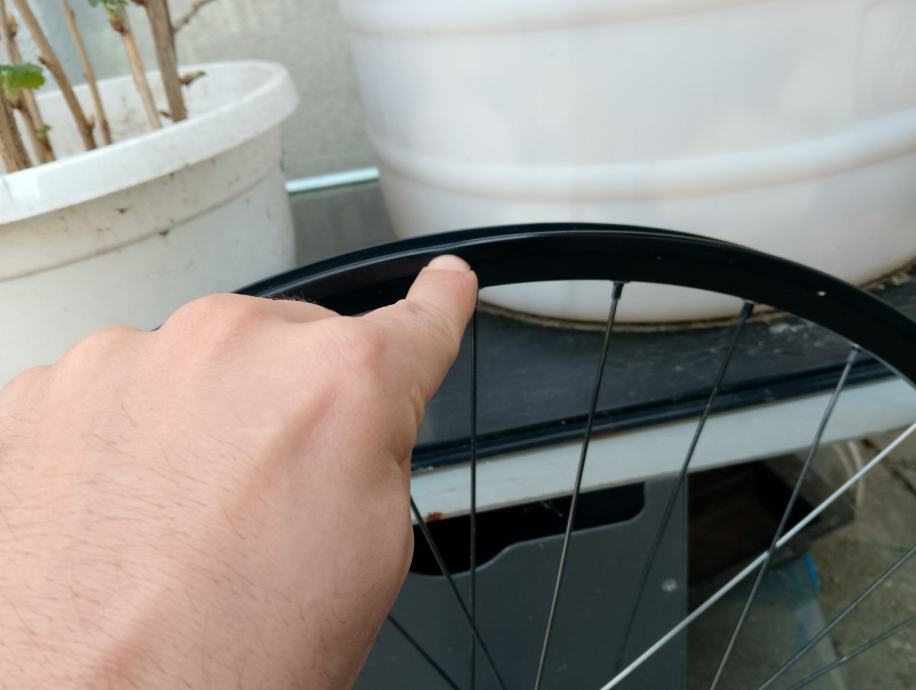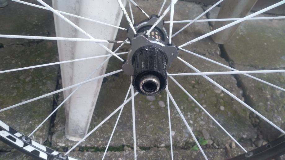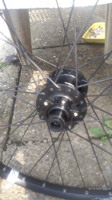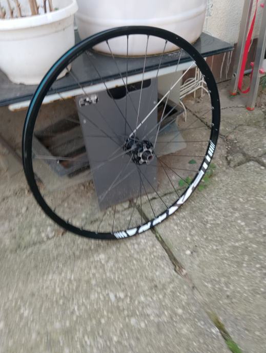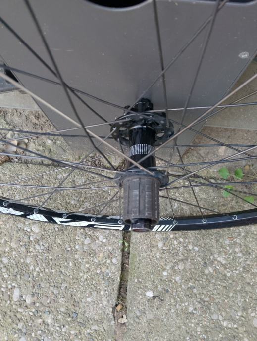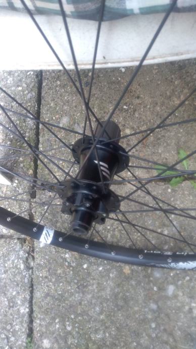 26" straznji kotac Roval (in house brand kotaca od Specialized-a) za 12mm through axle osovinu, oni nemaju svoje nabe - izgledom, tezinom i zvukom to je DT SWISS, extra lagan, brz i atraktivan kotac, 6 bolt prihvat diska, jako lijepo se vrti, cijena je max spustena 50E zbog sljedecih nedostataka: ima mali dent koji se nije uopce skuzio u voznji, tek kad se skinuo kotac te 2 zbice su krive (poslikano uz prst da se vidi o cemu tocno pricam). Idealno za dijelove. (16-20)