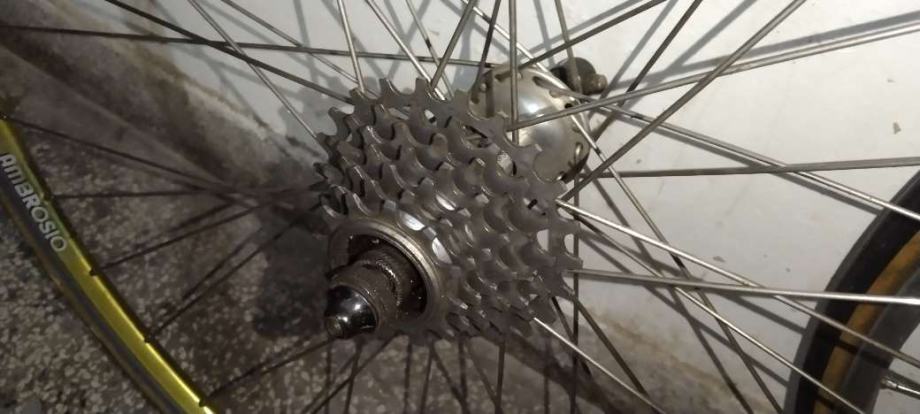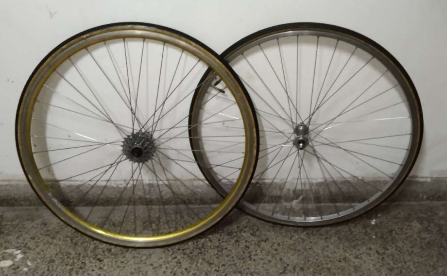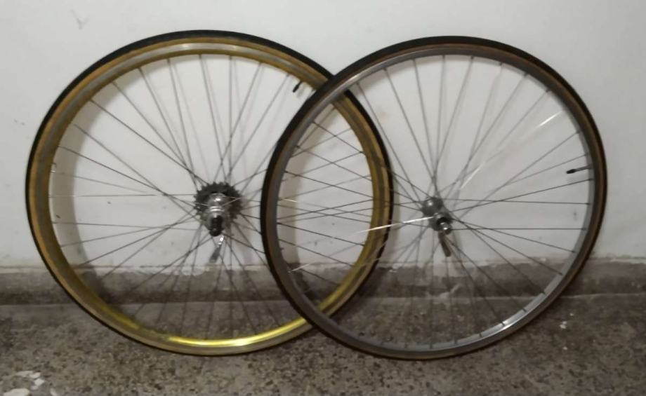 Vintage old school kotači 28" uredni odlično se vrte, raspareni stražnji obruč AMBROSIO , naba GIPIEMME SPRINT, kranc REGINA 7c, prednji obruč ALESA Belgium, naba MAILLARD France. Kotači pogodni kao rezervni ili za neki projekt lagani trekking ili City bike, dolaze kompletni sa vanjskim i unutarnjim gumama, cijena 70€. Šaljem poštom ili busem nakon uplate ili osobno preuzimanje pouzečem ne šaljem.