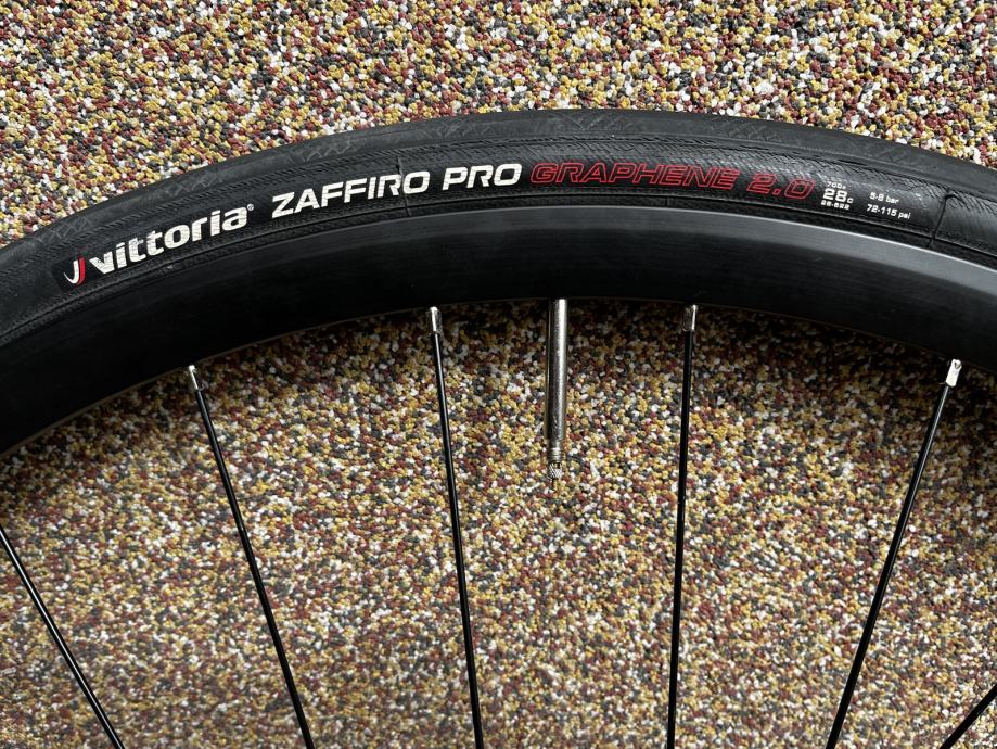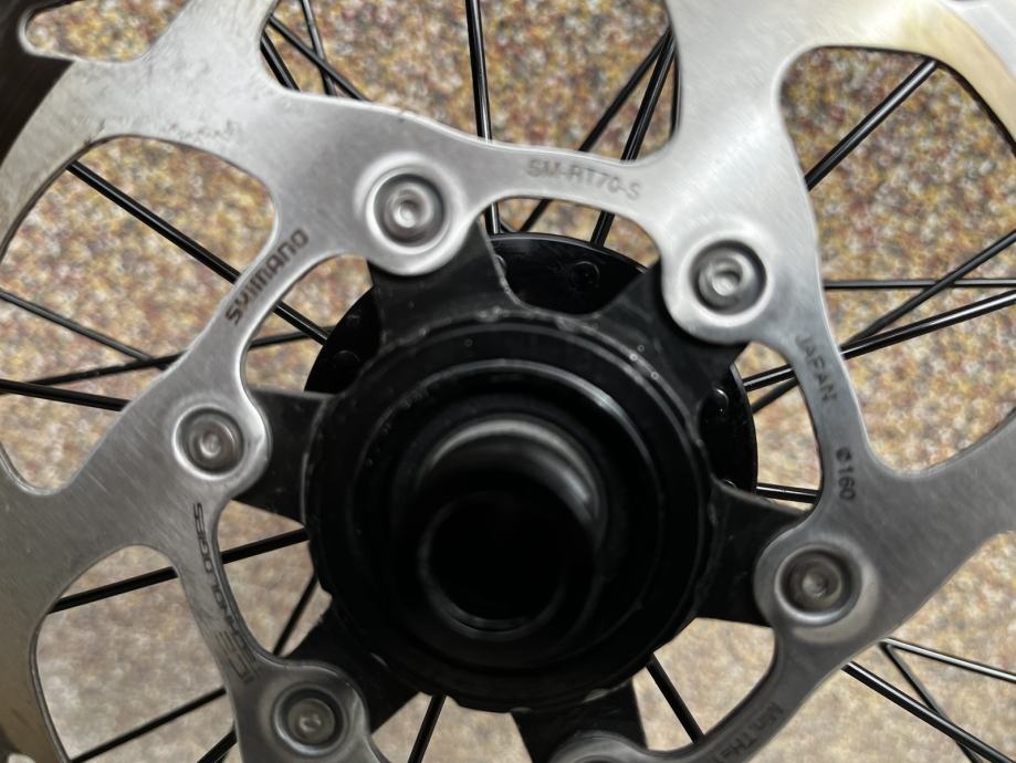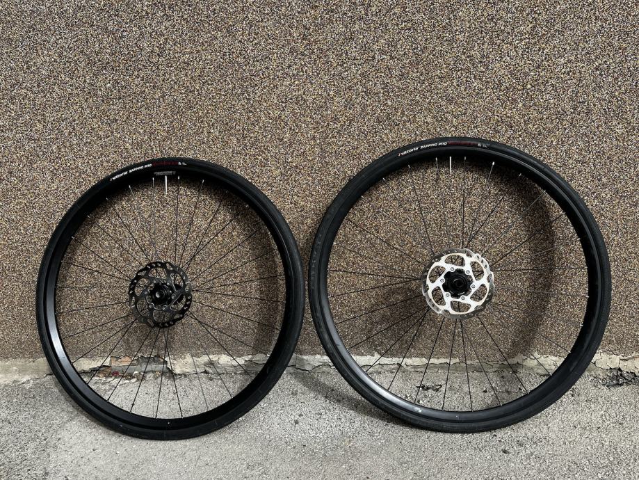 Težina prednjeg kotača 785 g, težina stražnjeg kotača 945g, bez diskova, gume i zračnica. Skinute naljepnice tako da su kotači skroz crni, vidljivo na slikama, odlične za trening.